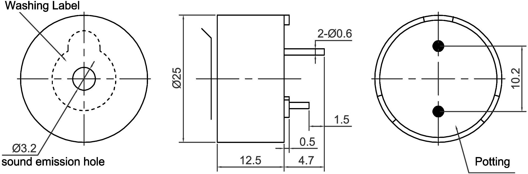 | Part No. | Diameter Φ (mm) | Height (mm) | Operating Voltage (VAC) | Rated Voltage (VAC) | Max Rated Current (mA) | Coil Resistance (Ω) | Min Sound Output (dBA) | Resonant Frequency (Hz) | Operating Tempature (°C) | Terminal | Housing | Weight (g) |