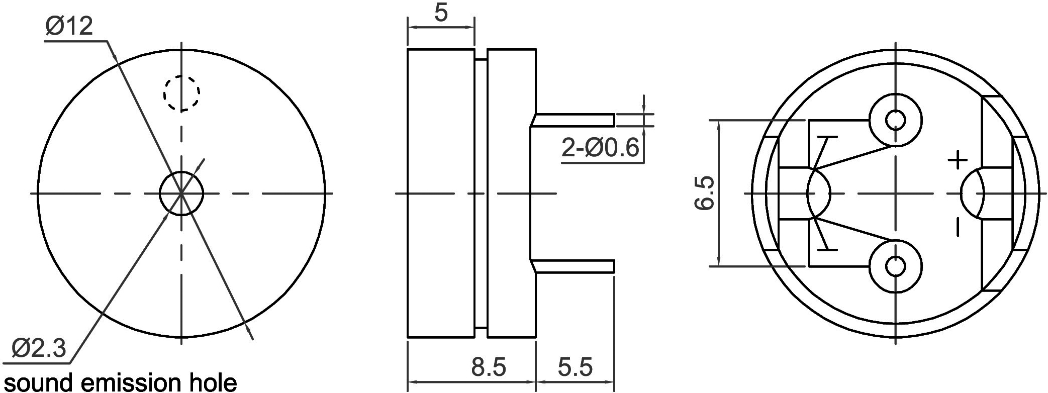 | Part No. | Diameter Φ (mm) | Height (mm) | Operating Voltage (VAC) | Rated Voltage (VAC) | Max Rated Current (mA) | Coil Resistance (Ω) | Min Sound Output (dBA) | Resonant Frequency (Hz) | Operating Tempature (°C) | Terminal | Housing | Weight (g) |
